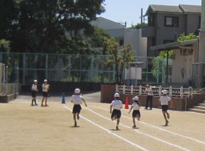 1年生の記録が伸びるように・・・と考えた6年生がコースの横で伴走?しています