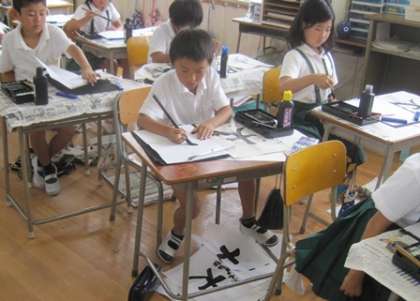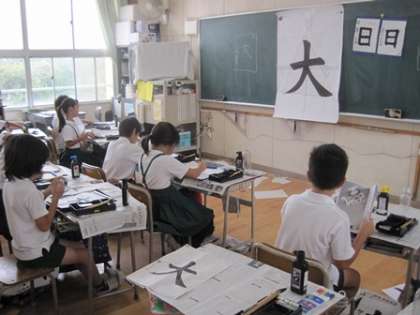 3年2組が書写の学習で毛筆で「大」の字を書いていました。