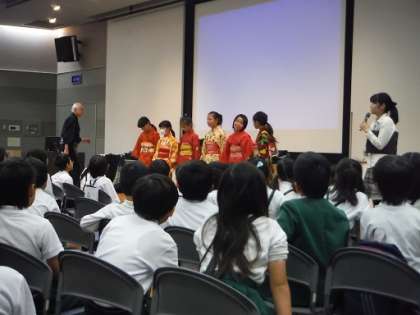 まず、3Fホールで体験学習を行い、昔の道具クイズなどをしました。着物を着せてもらった女の子もいました。