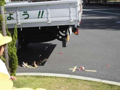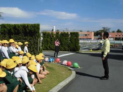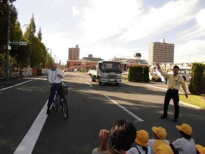 5年生はトラックの内輪差について風船を使って実験してくださいました。思ったよりも車の後輪が内側を通ることがわかりました。また、交差点でのトラックと自転車の動きを再現してもらい、スマホや音楽を聴きながらの運転がいかに危険かわかりました。