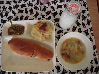 今日のこんだて:牛肉と野菜のケチャップソテー、スープ、スイートポテト、レーズンパン、牛乳