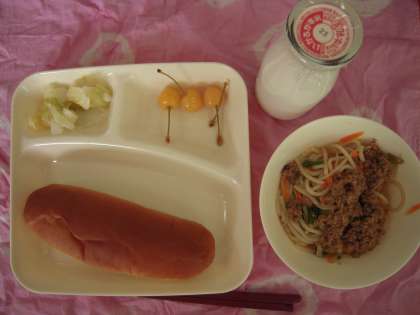 今日のこんだて:タンタンめん、キャベツの甘酢づけ、さくらんぼ(缶づめ)、黒糖パン、牛乳