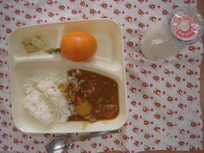 今日のこんだて:ポークカレーライス(米粉)、はくさいのピクルス、みかん、牛乳