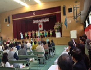 お祝いの式の後には、緑マーチングバンドや、子ども会 グリンモンスタ−、子ども舞踊等で、みどり小学校の人が演技を披露しました。