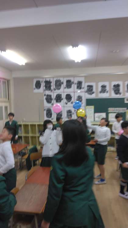 屋外スポーツクラブは、雨天のため室内で活動しています。風船バレーですね!
