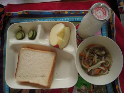 今日のこんだて:肉うどん、きゅうりの甘酢づけ、りんご、食パン、マーガリン