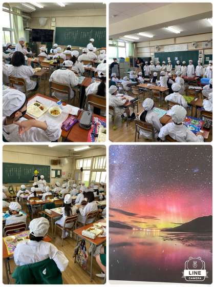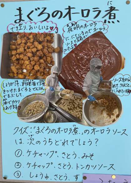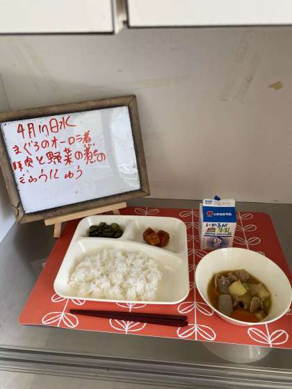 まぐろのオーロラ煮は、子どもたちに人気の献立です。1年生の給食を運んでくれた6年生に、1年生がありがとうと言われて、とてもうれしそうでした。