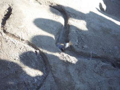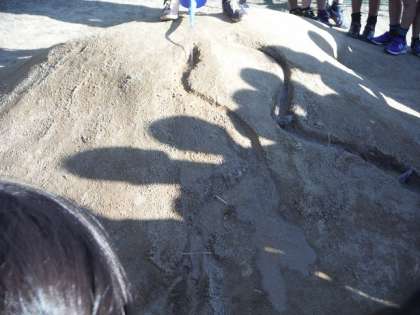 多目的室でお話を聞いた後、運動場に出て実験をしました。右側がダムのある川、左側はダムのない川です。右側の川はダムで土砂が遮られているのに対して、左側の川は下流で水があふれているのがわかります。