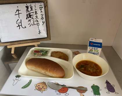 ミネストローネは、イタリア語で「具だくさん」という意味で、今日の給食では、鶏肉とキャベツ、たまねぎ、にんじん、トマト、パセリなどの野菜が使われています。