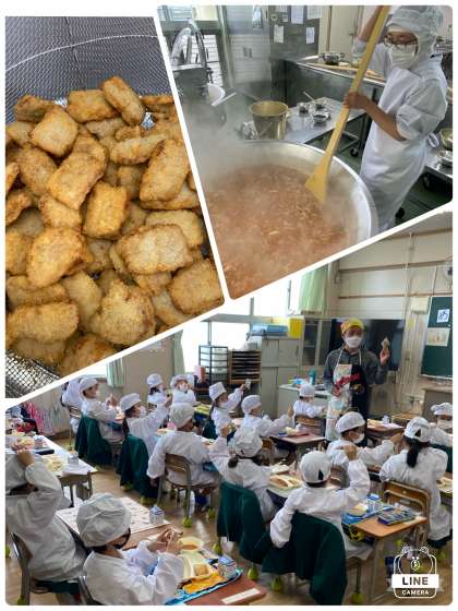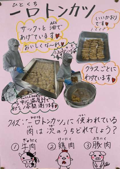 一口トンカツは子どもたちに人気の献立です。2年生のクラスに行くと、「一口では食べられないのになんで一口トンカツという名前やろ?」「パンにはさむとおいしいー!」など楽しい給食時間を過ごしていました。
