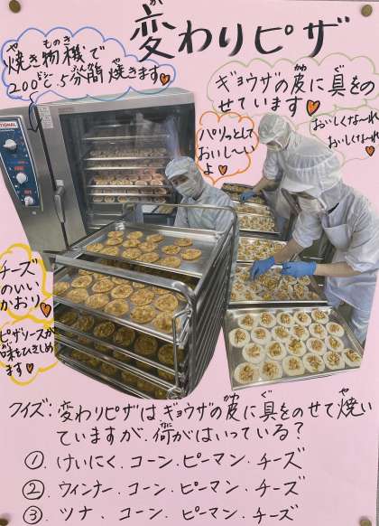 給食の変わりピザは、ぎょうざの皮に、ツナ、コ—ン、ピーマン、ピザソース、チーズを混ぜ合わせた具をのせ、焼き物機(大型のスチームコンベクションオーブン)で焼いています。