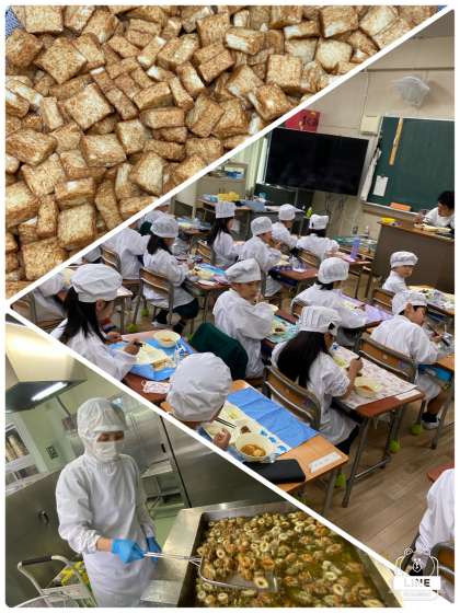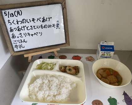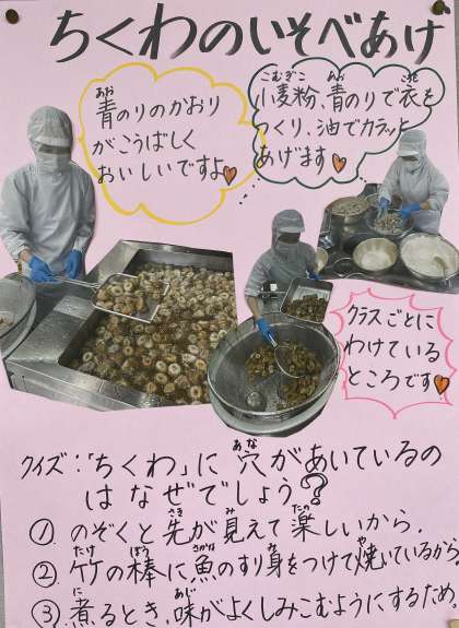 「ちくわのいそべあげ」は子どもたちや教職員にも人気があり、「あつあげとさといもの煮もの」といっしょにごはんが進む献立でした。