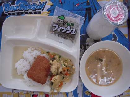 今日のこんだて:カツ丼、みそ汁、ミニフィッシュ、牛乳