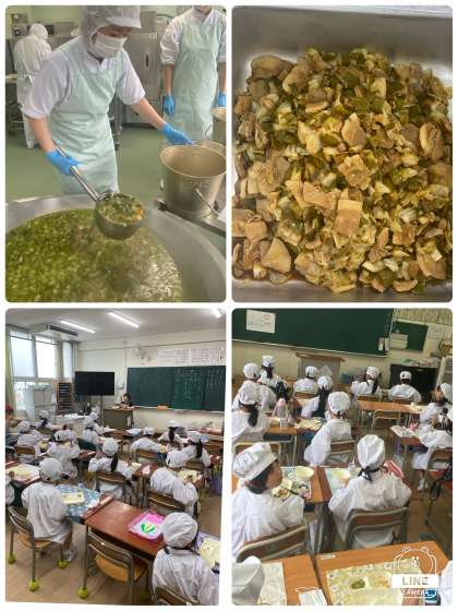 給食では、豚ばら肉をゆでてから、ほかの材料と一緒にいためています。
