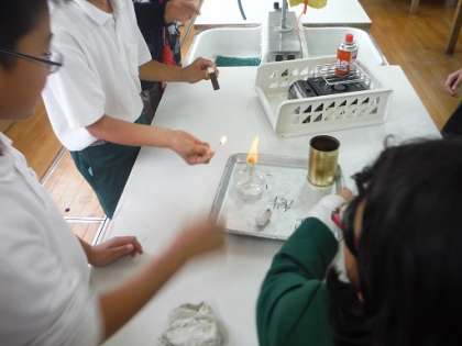 理科の学習では、アルコールランプの使い方を学びました。マッチを初めて使う児童もいましたが、全員アルコールランプに火をつけて消す体験をしました。