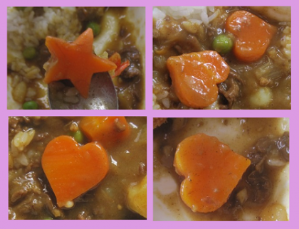 今日の給食のカレーライスの中に、「ハート型」と「星型」のにんじん(ラッキーにんじん)がありました。これは給食調理員さんが、ひとつひとつ型ぬきをしてから、形が崩れないようにべつの鍋で調理したものです。配かんのときに、先にカレールーを入れてから、最後にラッキーにんじんを各クラス均等に配っているそうです。自分のお皿の中に、ラッキーにんじんを見つけた子どもたちはとてもうれしそうにお友達に話していました。