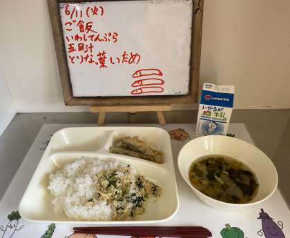 いわしてんぷらは、砂糖、みりん、米酢、こいくちしょうゆで作ったたれをかけたごはんが進む献立でした。