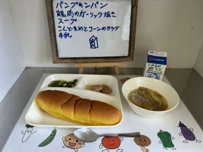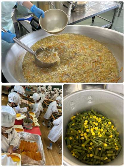 今日のさんどまめとコーンのサラダも、生のさんどまめを使用していてコーンとの組み合わせもよく、児童にも好評なサラダです。