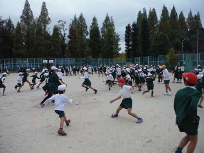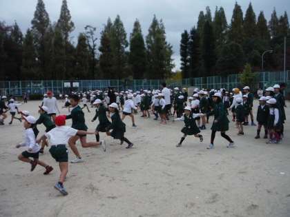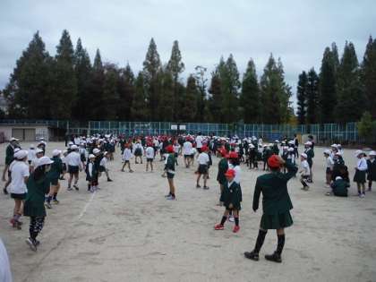 今日の児童集会は「となりの町までいってQ」でした。運動場の間を