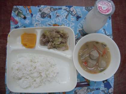 今日のこんだて:豚肉とまいたけのいためもの、つみれ汁、かぼちゃういろう、ごはん、牛乳