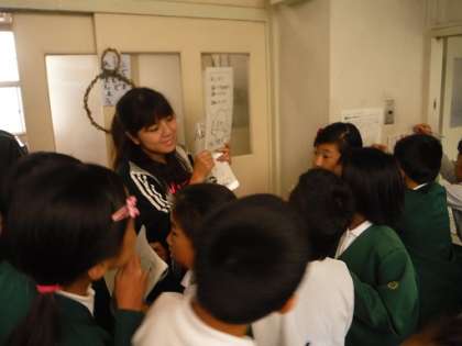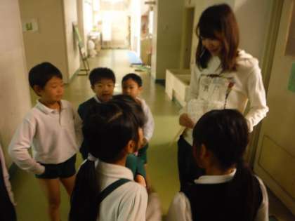 子どもたちは、休み時間に、先生たちに場に応じたあいさつをしてクイズを考えていました。