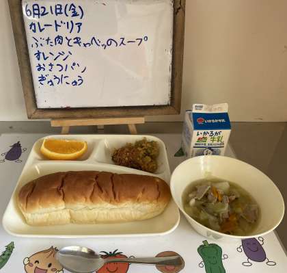 給食では、カレールウの素(米粉)やクリームなどを使ったカレードリアが登場しました。子どもたちにとても人気の献立です。