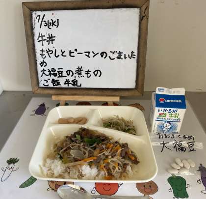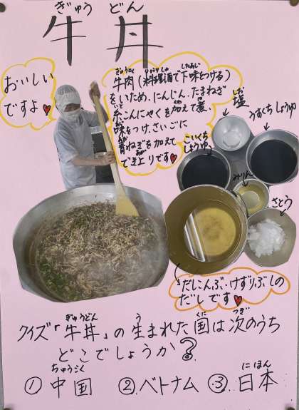 今日は、子どもたちに大人気の「牛丼」でした。昨日から「、明日は牛丼やなあ、楽しみ」といううれしい声が聞こえていました。