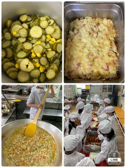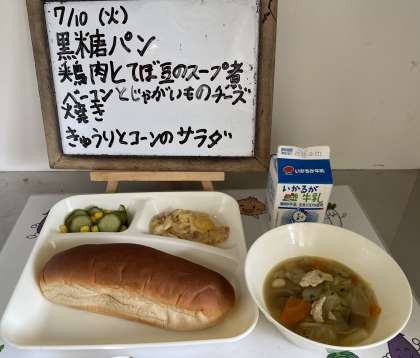 「じゃがいもとベーコンのチーズ焼き」は、子どもたちに人気の献立です。きゅうりとコーンのサラダも彩りよく、食欲が増す一品でした。