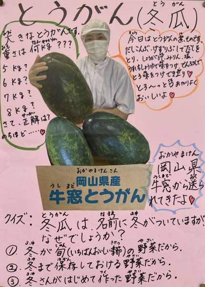 とうがんは、夏のたくさんとれます。夏に収穫したものを冬まで保存できることから、漢字で「冬」の「瓜」と書いて「冬瓜」と読みます。