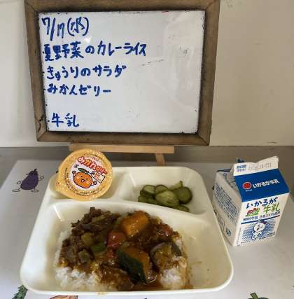 今日は気温が高く梅雨が明けたような快晴。昨日から、明日は夏野菜カレーライスとみかんゼリーと楽しみにしていた子どもたちがたくさんいました。