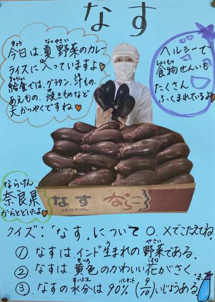 クイズの答えは、1番〇、2番、×、3番〇です。なすは、はむらさきのかわいい花が咲きます。