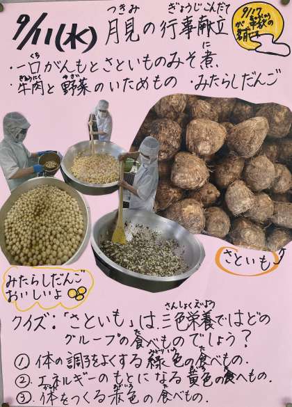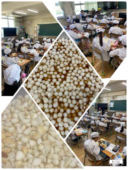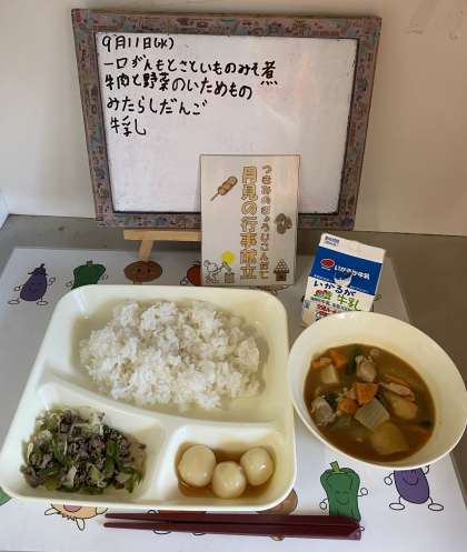 今日の給食では、「一口がんもとさといものみそ煮」と「みたらしだんご」が出ました。