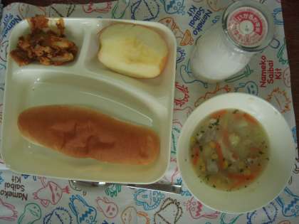 今日のこんだて:ミートグラタン、コーンスープ、りんご、コッペパン、牛乳