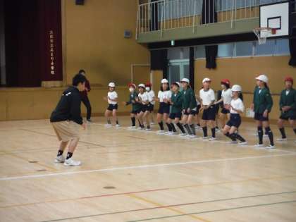 ウォーミングアップでは、バスケットボールで必要な動作を中心に体を動かしました。