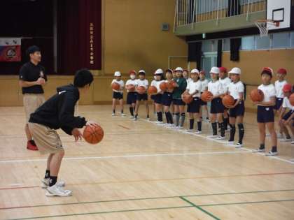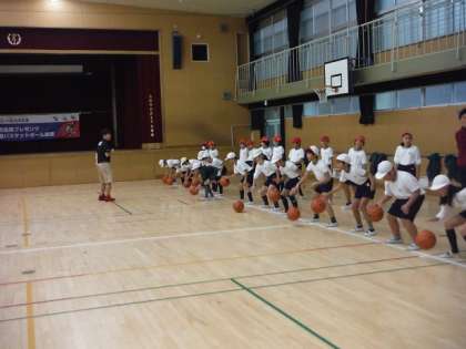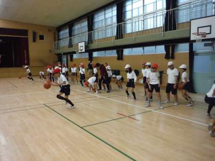 次にドリブルの練習をしました。ドリブルの姿勢、ボールのつき方、ボールのタッチの仕方など教えていただきました。4人チームでドリブルリレーもしました。