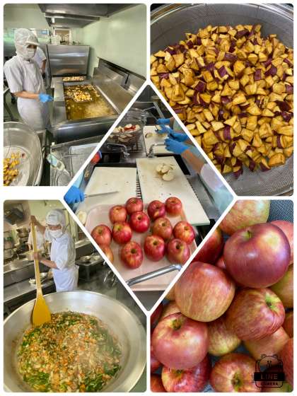 具沢山の中華煮は、彩りもよくボリュームがあり人気の献立です。それに、大学いもとデザートのりんご、低学年の児童が「デザートが2つもある」とうれしそうでした。