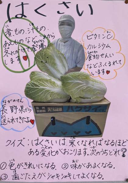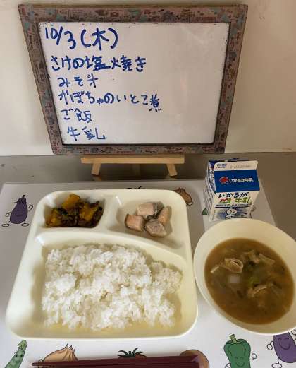 はくさい、うすあげ、たまねぎ、彩りに青ねぎを使用したみそ汁は、暑さが和らぎ少し過ごしやすくなった今の気候にぴったりの汁もので子どもたちは残さず、食べてくれていました。