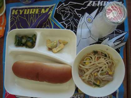 今日のこんだて:みそラーメン、きゅうりの辛みづけ、焼きさつまいもの甘みつかけ、黒糖パン、牛乳