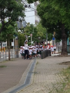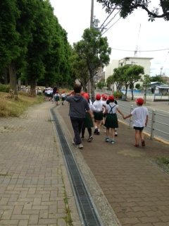 朝からぐずぐずした天気でしたが、1年生が生活科の学習で、学校のすぐ横の児童公園へ行きました。