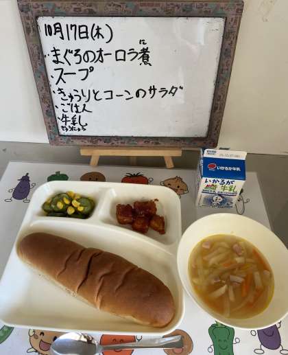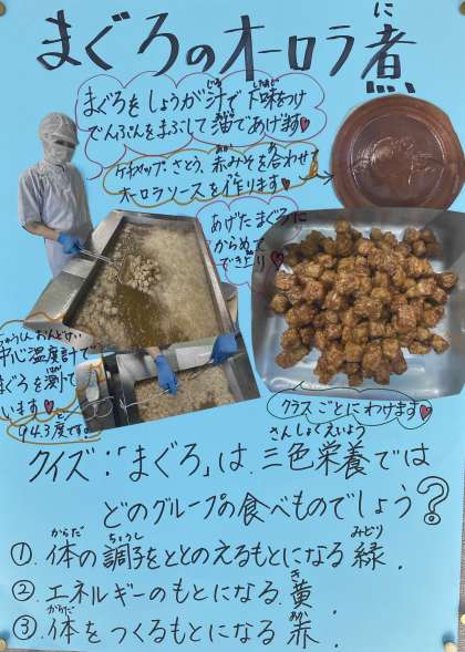 「まぐろのオーロラ煮」は子どもたちに大人気の献立です。しょうが汁、料理酒で下味をつけたまぐろにでん粉をまぶし、油で揚げソースソースにからめます。