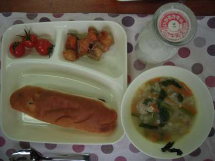 今日のこんだて:さけのマリネ、肉だんごと麦のスープ、プチトマト、レーズンパン、牛乳
