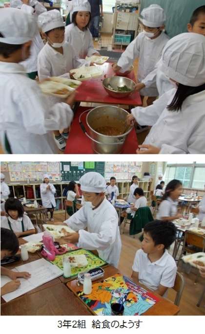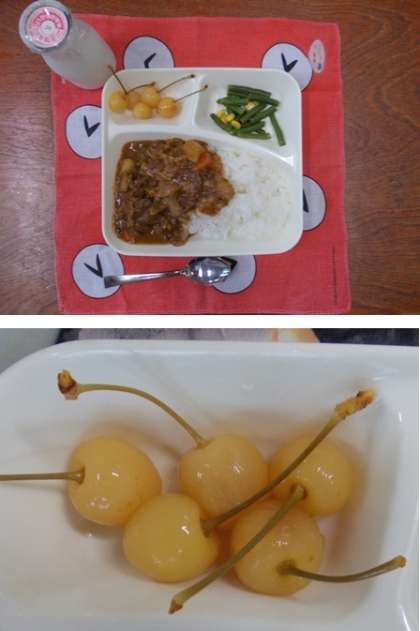 給食に使われているさくらんぼ(缶づめ)は、色をつけていないもので、自然のままの色をしています。