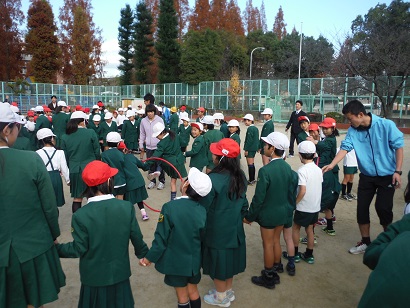 今日の児童集会は「みんなで協力 フラフープくぐり」でした。