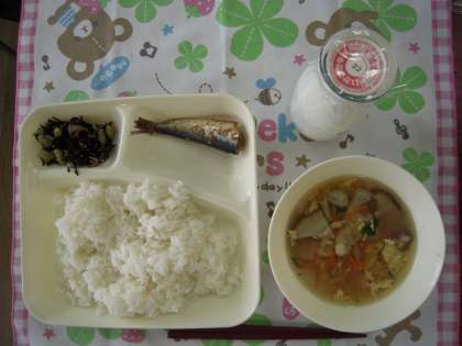 今日のこんだて:いわしのしょうが煮、かきたま汁、ひじきのそぼろ煮、ごはん、牛乳