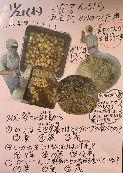 今日の献立はカリカリいかてんぷら、だしの香りがやさしい味の五目汁、手作りのりのつくだ煮、ごはんによく合う和の献立でした。