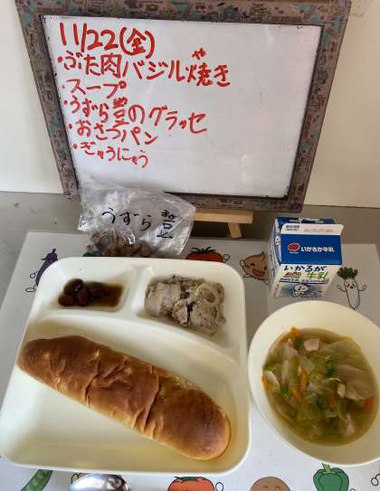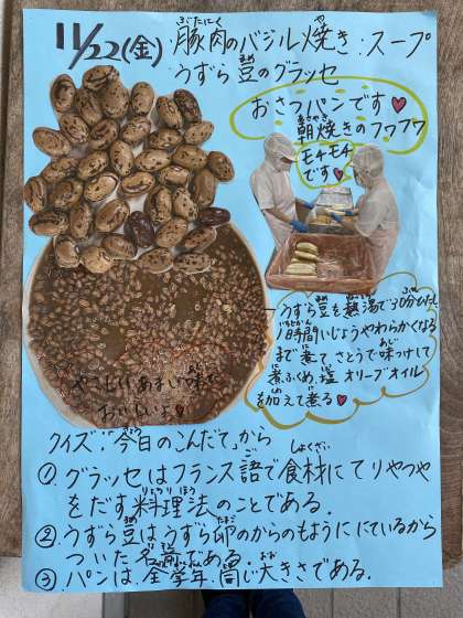 うずら豆のグラッセは、「甘くておいしーい!!」と子どもたちや教職員にも人気の献立でした。どのクラスも、金曜日の和やかな給食風景でした。