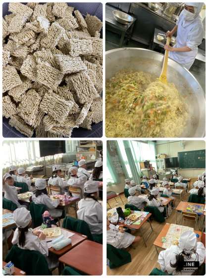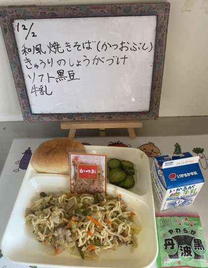ソース味も人気ですが、今日の和風焼きそばも子どもたちに人気の献立で、どのクラスも食缶の中は空っぽでした。