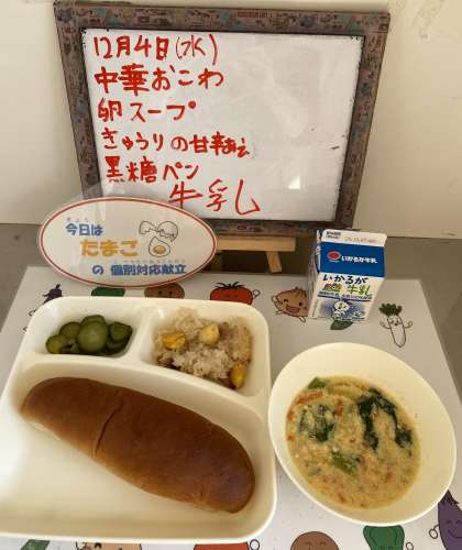 今日の給食は、もち米、くり、干ししいたけ、焼き豚の入った「中華おこわ」です。