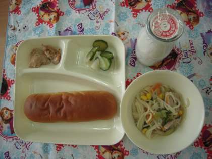 今日のこんだて:鶏肉のオイスターソース焼き、ラーメン、ピリ辛あえ、パン、牛乳