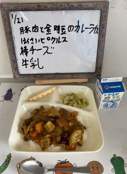 今日は、豚肉と金時豆のカレーライスでいつもより甘くまろやかな味で大好評でした。どのクラスも食缶の中は空っぽでした。ごちそうさまでした。❤